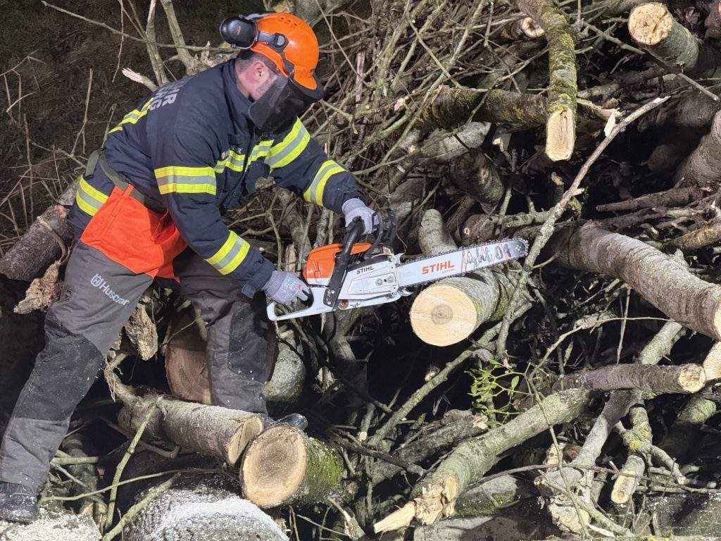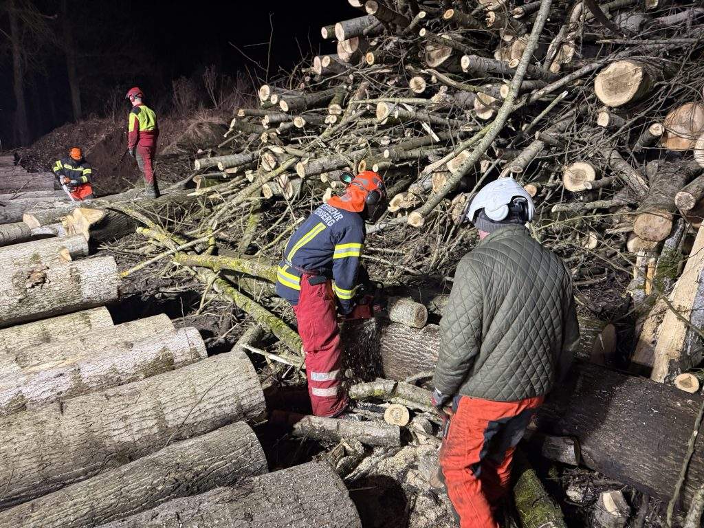 Im Anschluss teilten wir uns in zwei Gruppen auf und übten verschiedene Schnitttechniken sowie den sicheren Umgang mit der Motorsäge im praktischen Einsatz. Dabei konnten sowohl Anfänger als auch erfahrene Kameradinnen und Kameraden ihr Wissen vertiefen und wertvolle Erkenntnisse mitnehmen.
